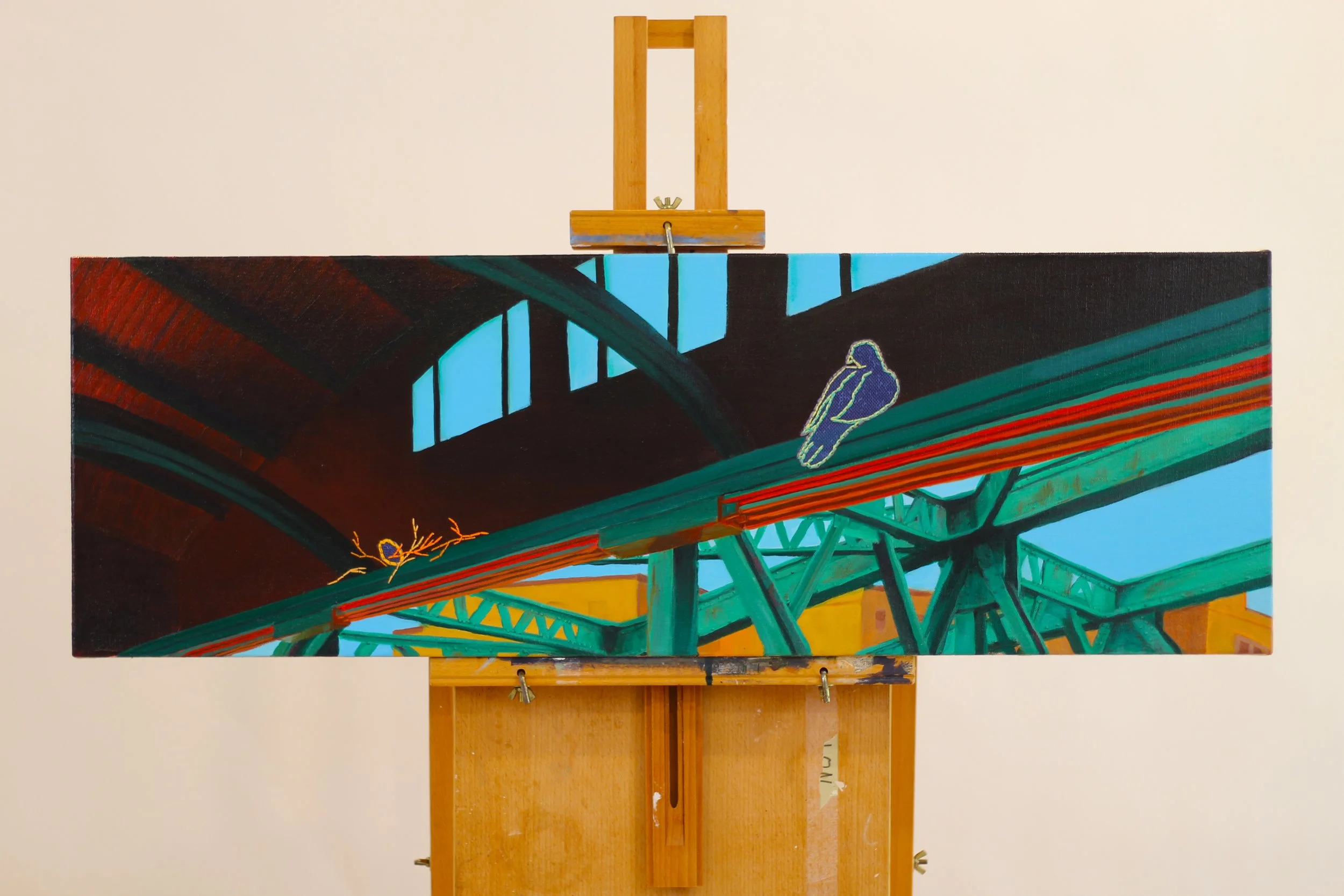 Flashe, Acrylic paint, Tulle, Needle and thread on Linen